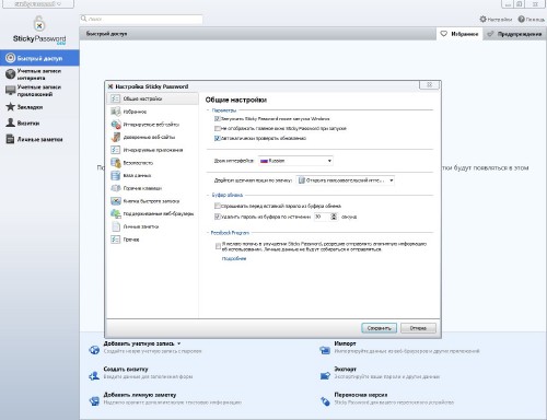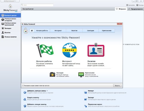 Основные возможности Sticky Password: • Защитник паролей использует новейшие технологии и противостоит кейлоггерам и другим шпионским программам. Он информирует пользователя о попытках компьютерных программ и библиотек заполучить информацию из других программ. • Переносная версия позволяет иметь пароли всегда под рукой. Sticky Password можно запускать с любого переносного устройства - USB диска или даже с CD. • Открывать доступ к паролям, используя USB или Bluetooth устройство. Теперь вам совершенно не нужно вводить пароль. • Пароли защищены мощными алгоритмами шифрования, которые невозможно взломать за приемлемое время. • Автоматическое заполнение форм работает для любых программ и вэб-страниц. Пароль, логин и другие поля заполняются автоматически только если это необходимо. • Вы можете сохранить несколько паролей и логинов для одного аккаунта. • Простота в использовании: вы можете использовать и изменять сохраненную информацию прямо из окна программы, которая их использует. • Автоматическое резервное копирование базы паролей: измененные или удаленные пароли могут быть восстановлены в любое время.